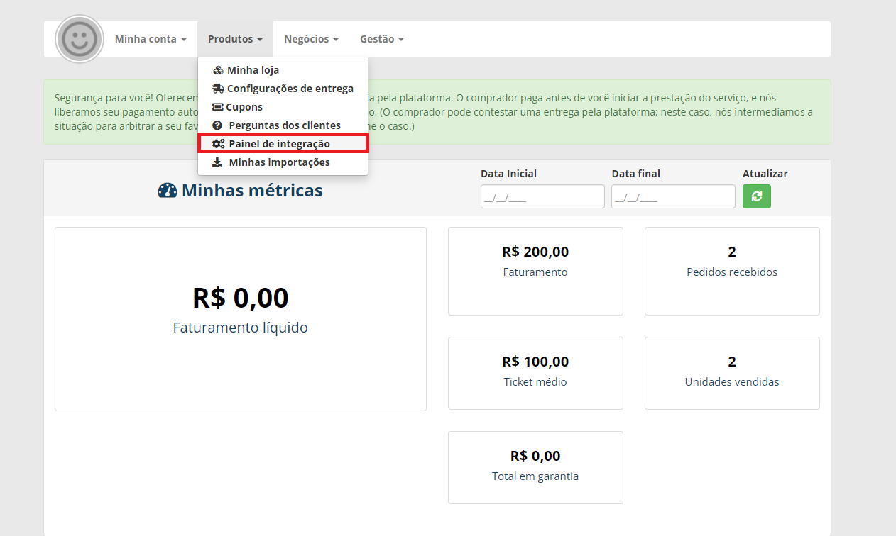 O vendedor deve acessar o seu painel de gestão, selecionando o menu “PRODUTOS -> PAINEL DE INTEGRAÇÃO”