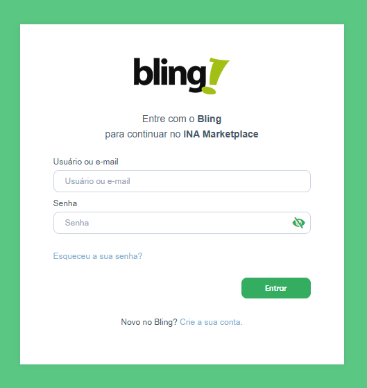 Ao clicar em Autorizar Integração, você vendedor é redirecionado para o login da Bling. Caso já tenha uma conta basta preencher o formulário com seu login e senha e clicar em Entrar, e caso ainda não tenha, pode pode clicar no link 'Crie sua conta'.