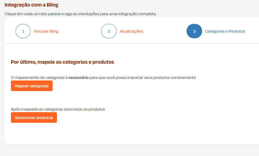 Siga atentamente as orientações descritas em tela para finalizar esta etapa e em seguida clique em 'Categorias e Produtos'