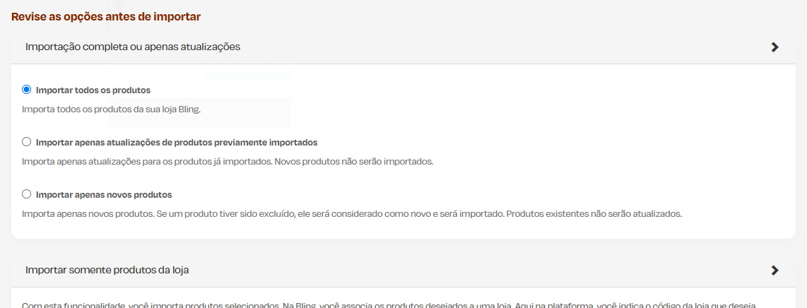 Ao clicar em "Importar produtos da Bling", você será redirecionado para o mesmo formulário exemplificado no Passo 9, permitindo selecionar novamente entre as opções já configuradas e prosseguir com uma nova importação.