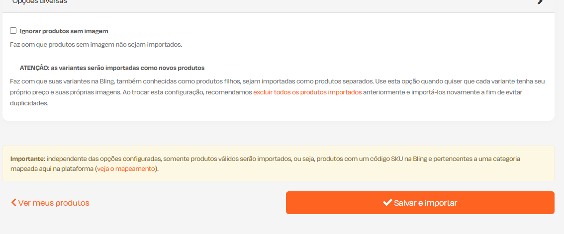 É possível configurar as seguintes opções para a importação dos produtos: