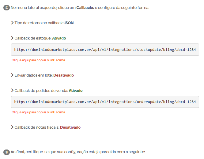 Nesta etapa você encontra os links de webhook (endereços no formato de URL) que podem ser copiados e colados na sua conta Bling, no aplicativo da loja integrada (Ideia no Ar).