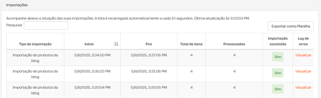 O sistema também disponibiliza uma lista de importações, que inclui quantos produtos foram processados, quantos produtos foram importados com sucesso, e um um log informando os produtos que não foram importados e o motivo para cada caso.